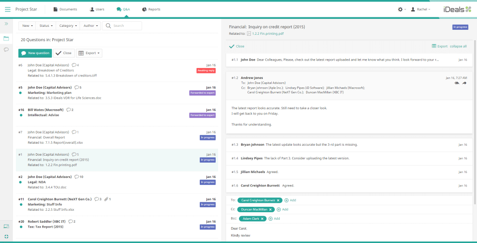 - La collaborazione è abilitata tra gli utenti con un flusso di lavoro in sala. In questo modo le informazioni e le discussioni sono contenute in modo sicuro all’interno della data room virtuale.