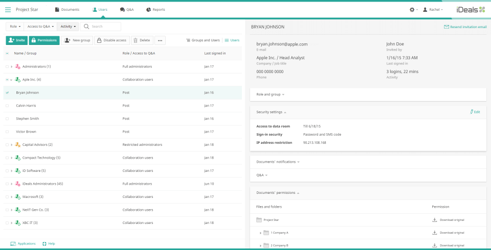 La virtual data room Ideals è tenuta in alta considerazioni per la sua sicurezza. Usa l’autenticazione a due fattori per creare gli accessi simili alla banca. È possibile inviando il codice all’utente tramite SMS.